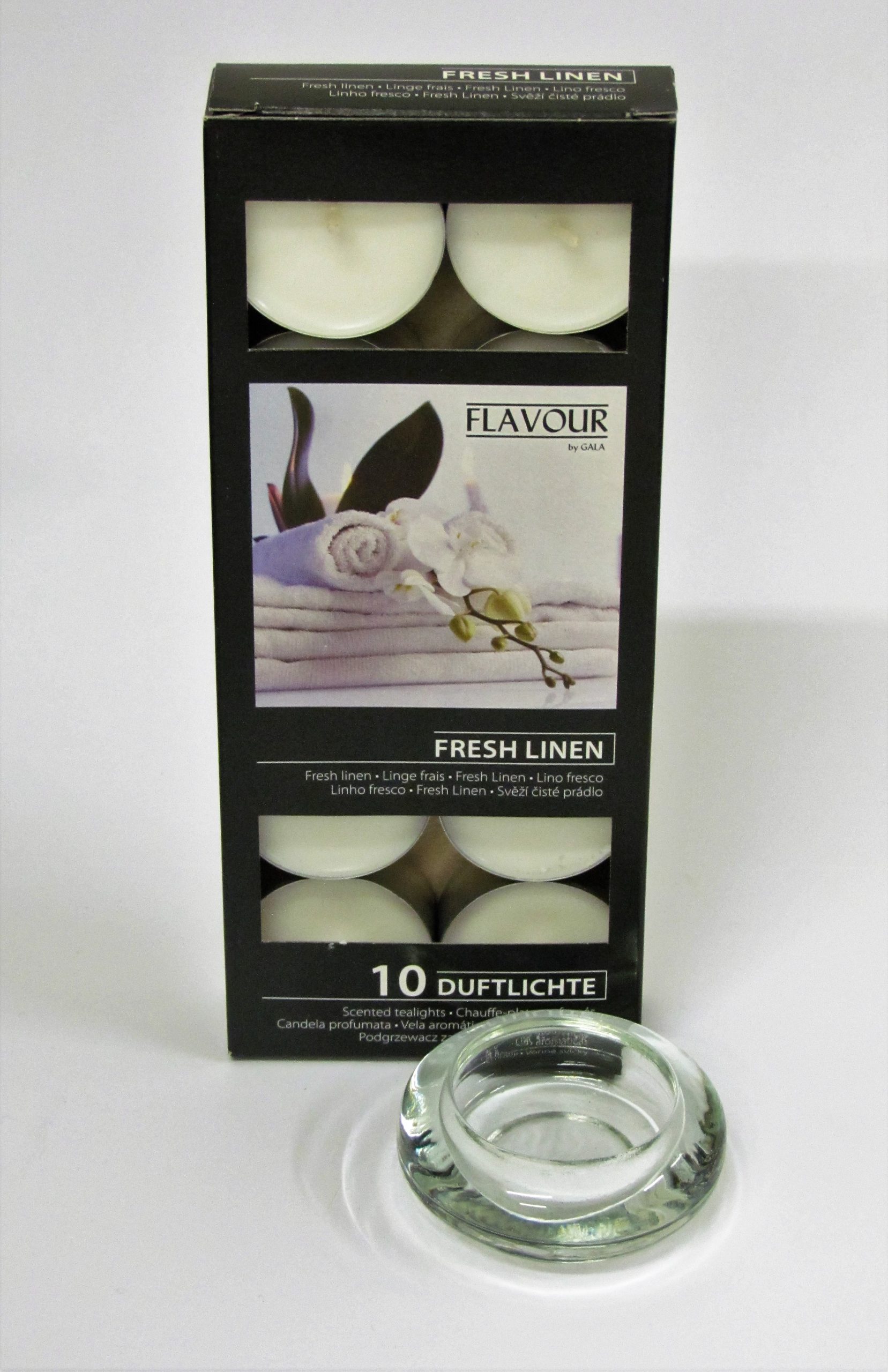 10 Fresh Linen Gala scented tealights and a tealight holder wrapped together.